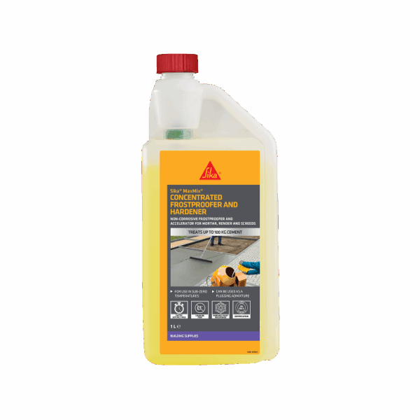 Sika MaxMix Concentrated Frostproofer and Hardener is a non-corrosive, air entraining frostproofer and accelerator for mortar, render and screeds.